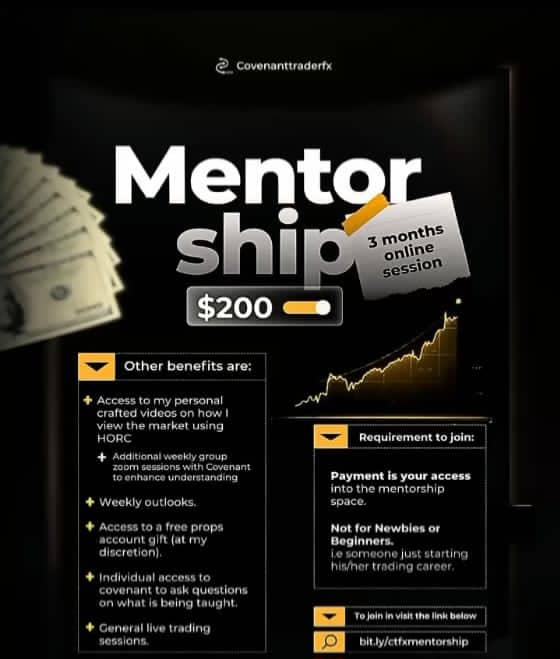 The Covenant TraderFX Mentorship is a 3-month intensive online training program designed to help intermediate traders master market precision, develop professional trading discipline, and scale into consistent profitability.